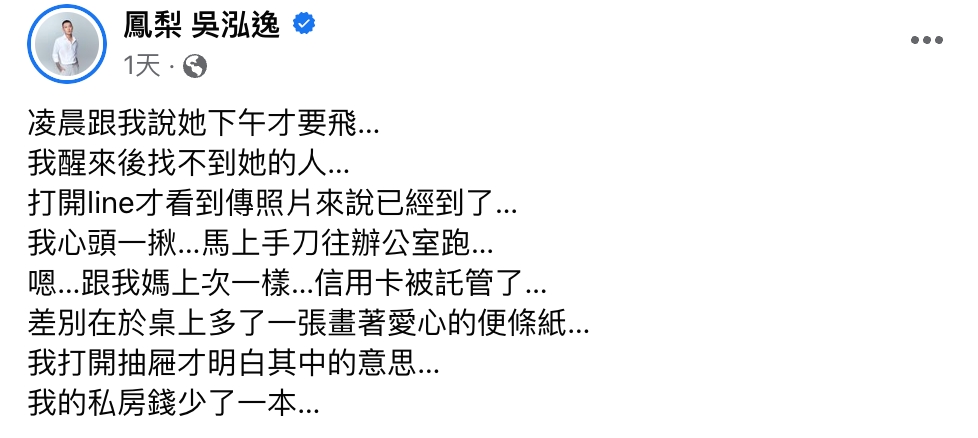 鳳梨12日曬出歐菈現身機場的照片,透露女友原本跟她說下午才要出國,沒想到早上醒來就已經不見人影,看訊息才知道已經提前到機場,但是他當下覺得事態不對勁,結果跟上次媽媽出國一樣,「信用卡被託管了」,差別在於這次多了一張畫著愛心的紙條,「我打開抽屜才明白其中的意思,我的私房錢少了一本,這張意義不明的廢紙值10萬嗎…」