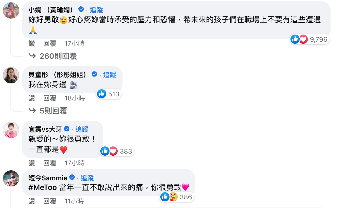 不僅如此,受害者之一的短今也表示:「當年一直不敢說出來的痛,妳很勇敢!」黃云歆則回覆:「謝謝當年一起在《臺灣舞孃》陪伴的妳,當時一起經歷的事,真的只有我們才懂……」就連貝童彤、大牙、阿翰都現身鼓勵。