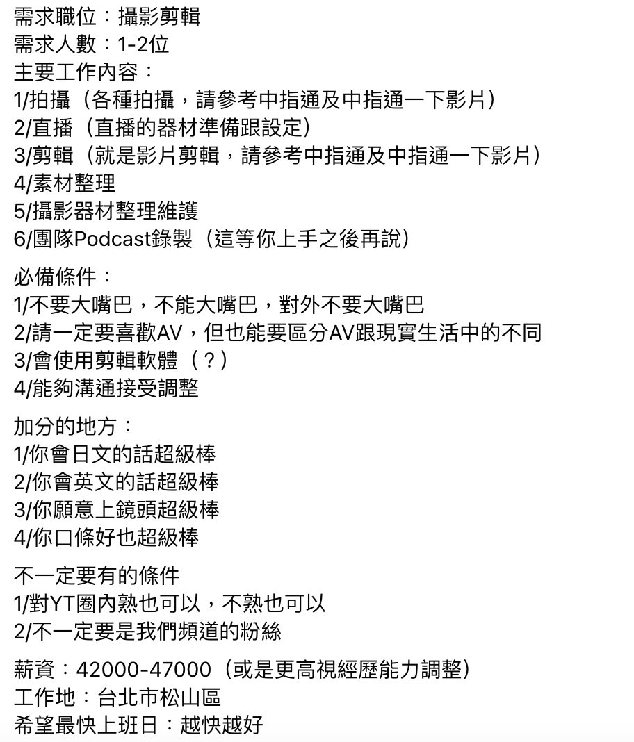 中指通團隊開出剪輯師的職缺,主要工作內容是拍攝、直播、剪輯、器材維護及Podcast錄製,必備條件是「對外不能大嘴巴」,而且「一定要喜歡AV,但也能要區分AV跟現實生活中的不同」,會使用剪輯軟體,也要能夠接受溝通調整。如果日文、英文很好,又或是口條不錯願意上鏡頭也會加分。薪資範圍依能力調整,大範圍是4萬2至4萬7,如果是新鮮人則會是4萬以下,但是3個月後依能力調薪,如果能力很好也有機會到5萬元。