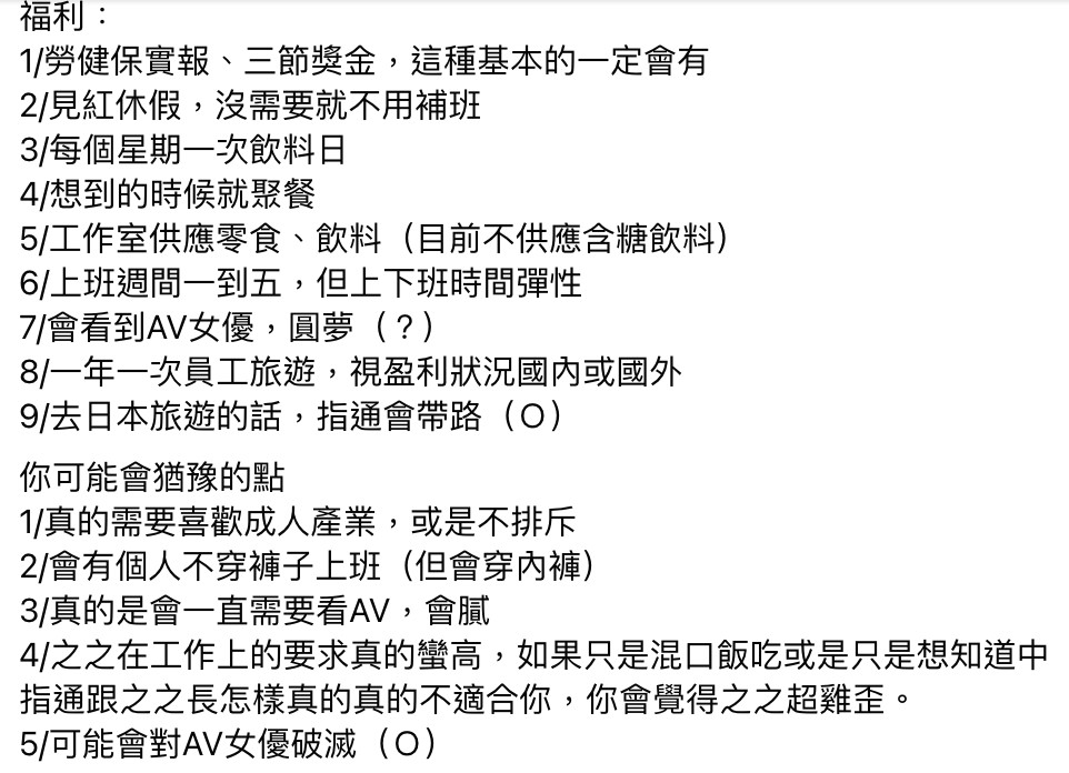 至於福利的部分,基本的勞健保、三節獎金都有,沒需要就不用補班,上下班時間很彈性,還能看到AV女優。雖然看似一切很美好,但中指通表示一定要喜歡成人產業,或是不排斥,而且團隊有人只會穿內褲上班,還會因為工作的緣故,所以需要一直看謎片,要有「會膩」的心理準備,甚至會因為合作所以導致幻想破滅。