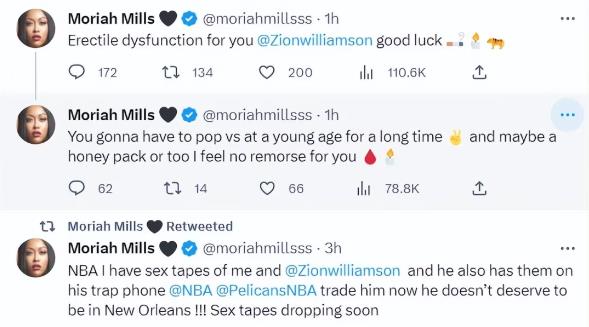 根據統計Mills至今已在社群軟體上發佈超過135條推特怒噴Zion,他甚至還爆料自己手上有與Zion的性愛影片,鵜鶘對應該交易掉他,他沒有資格再留在紐奧良!最後再度怒噴Zion表示「你對我沒有任何悔意!祝你好運,有關於你的勃起障礙!」