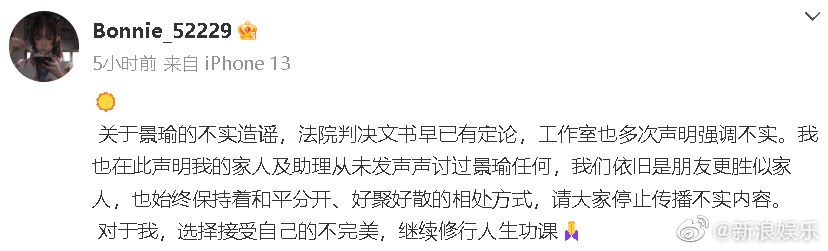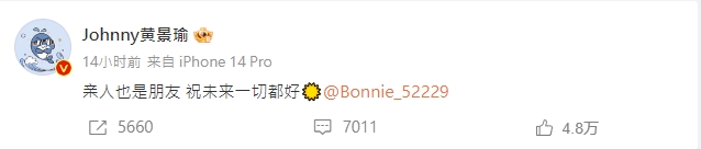 黃景瑜更直接在微博Tag王雨馨寫下:「親人也是朋友,祝未來一切都好。」也被認為是他首度承認兩人曾經結過婚,同時王雨馨也發文澄清,「我們依舊是朋友更勝似家人,也始終保持著和平分開、好聚好散的相處方式,請大家停止傳播不實內容。 對於我,選擇接受自己的不完美,繼續修行人生功課。」