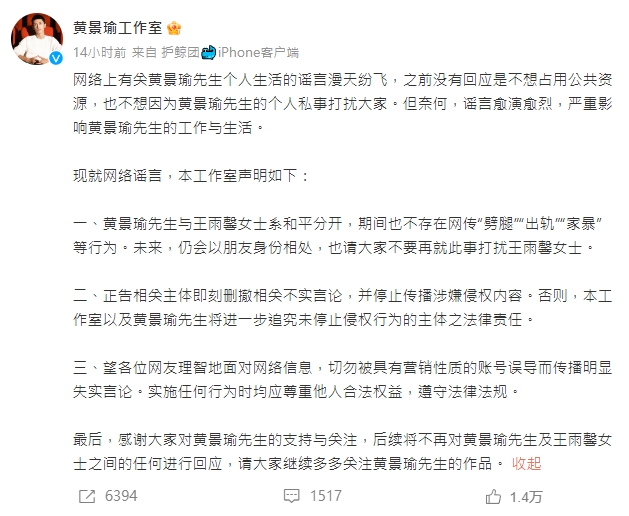 黃景瑜終於在20日凌晨和王雨馨同步發表聲明,男方強調和王雨馨是和平分開,「期間也不存在網傳『劈腿』、『出軌』、『家暴』等行為。未來,仍會以朋友身份相處,也請大家不要再就此事打擾王雨馨女士。」但還是隻字未提自己曾經有過一段婚姻,同時他們也強調要求外界刪除不實言論,不然將會追究法律責任。