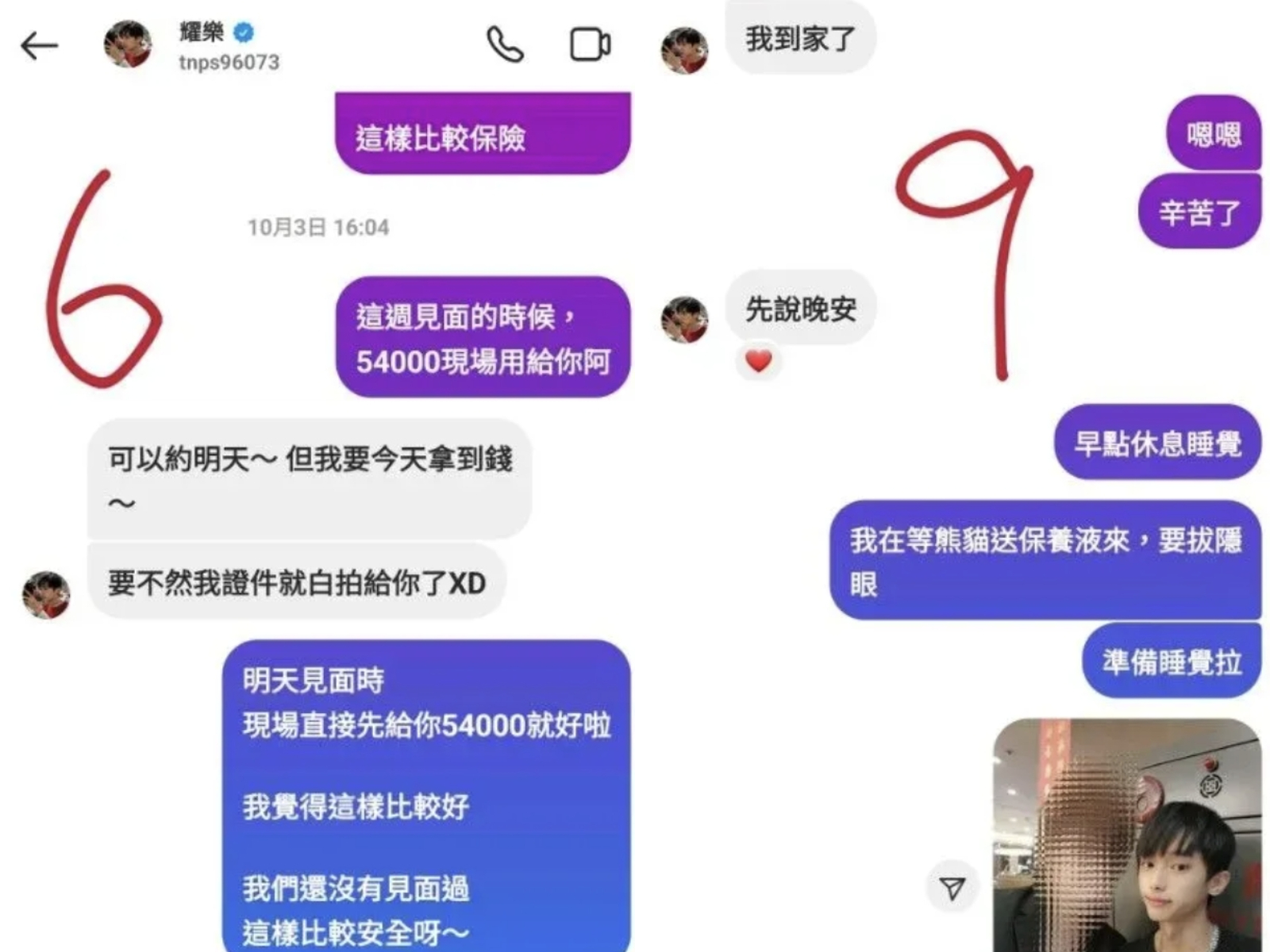 原PO看到耀樂出面踢爆炎亞綸後,忍不住表示:「耀樂自己怎都不想想他自己也不守信用,收了錢直接故意搞消失半年,不正常履行當初跟我朋友約定好的房間約會。」只見對話紀錄中,雙方原先約定好總共約會6次,一次付款9千元,耀樂還提供自己的帳戶及健保卡資料,並留下電話方便連絡。