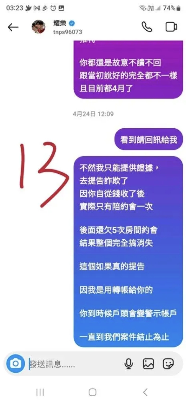 有網友透過「爆料公社」表示:「耀樂他當時私下IG跟我朋友約定好,只要我朋友私下給耀樂54000,耀樂他就跟我朋友開房約會6次。」結果第一次約會時,耀樂就直接把6次的錢一次拿走。至此之後,耀樂就開始神隱,起初先用各種理由避不見面,後面是直接消失。唯一開房間的一次,還是朋友堅持見面才給錢,所以才順利見到面,否則會被完全放鳥。
