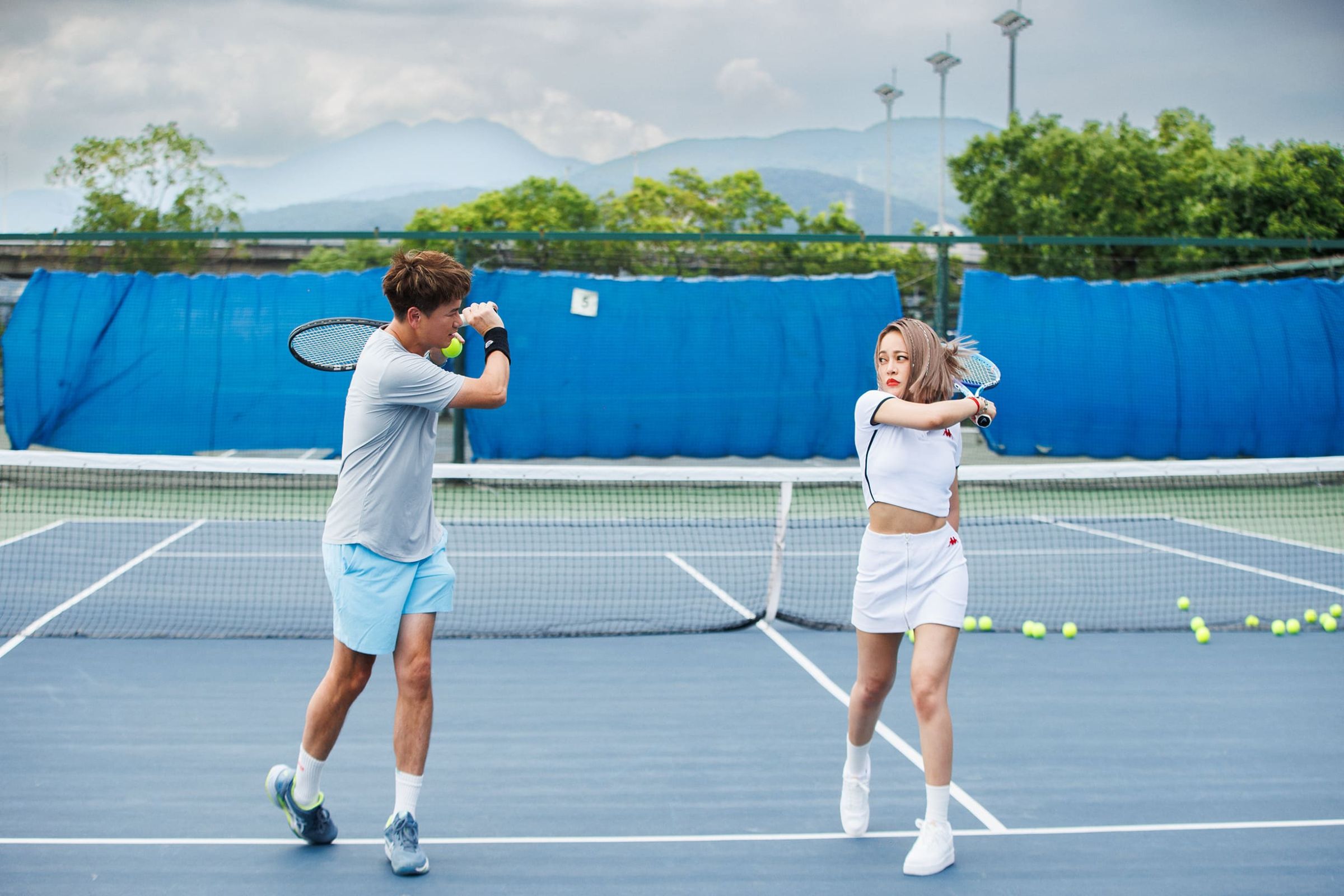 戴愛玲與李聖傑雙雙將於7月及9月舉辦個人演唱會,隨著演出時間逼近,李聖傑邀戴愛玲打網球練肺活力,首次嘗試網球的戴愛玲不但得先克服「怕球」心魔,也特地穿上一身網球裝,架勢十足迎戰,當天人生的第一顆發球也在眾人見證下順利擊出迎來好彩頭,為她增添不少信心!而率先於7/15在北流舉辦愛爾麗集團《故事的故事》巡迴演唱會的戴愛玲則分享最近日每天晨跑練體力;繼馬來西亞後9/17在新加坡開唱的李聖傑也以「學長」之姿祝福戴愛玲演出滿座,好評加場不斷,期望兩人之後的演出都有機會邀請彼此擔任嘉賓!