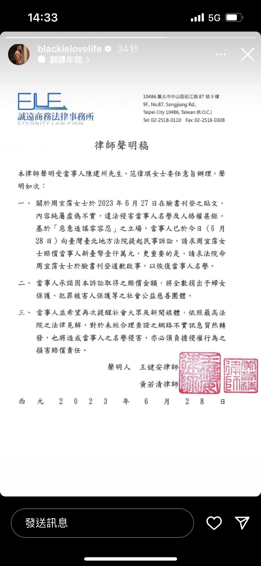今日稍早「黑人」陳建州再度透過社群軟體發出聲明稿,聲明稿內容表示周宜霈27日所發出的文章內容虛偽不實,且該內文嚴重侵害他的名譽以及人格,基於「惡意造謠零容忍」的立場,陳建州已向台北地方法院提起民事訴訟,並要求周宜霈賠償當事人新台幣壹仟萬元,以及在臉書刊登道歉啟事,賠償索取得的金額也將全數捐出並給予婦女團隊公益團體。