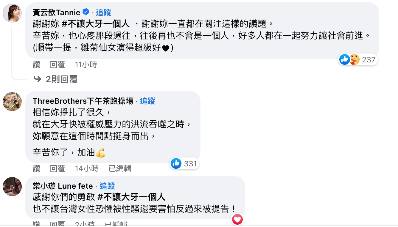 如今再回去看貼文,讓大家都感到很心疼,先前出面指控許傑輝騷擾的黃云歆心疼地說:「謝謝妳不讓大牙一個人,謝謝妳一直都在關注這樣的議題。辛苦妳,也心疼那段過往,往後再也不會是一個人,好多人都在一起努力讓社會前進。」其他人也紛紛表示:「謝謝你的勇敢」、「謝謝妳願意站出來一起當鐵板,加油!」、「妳不是孤軍奮戰!」