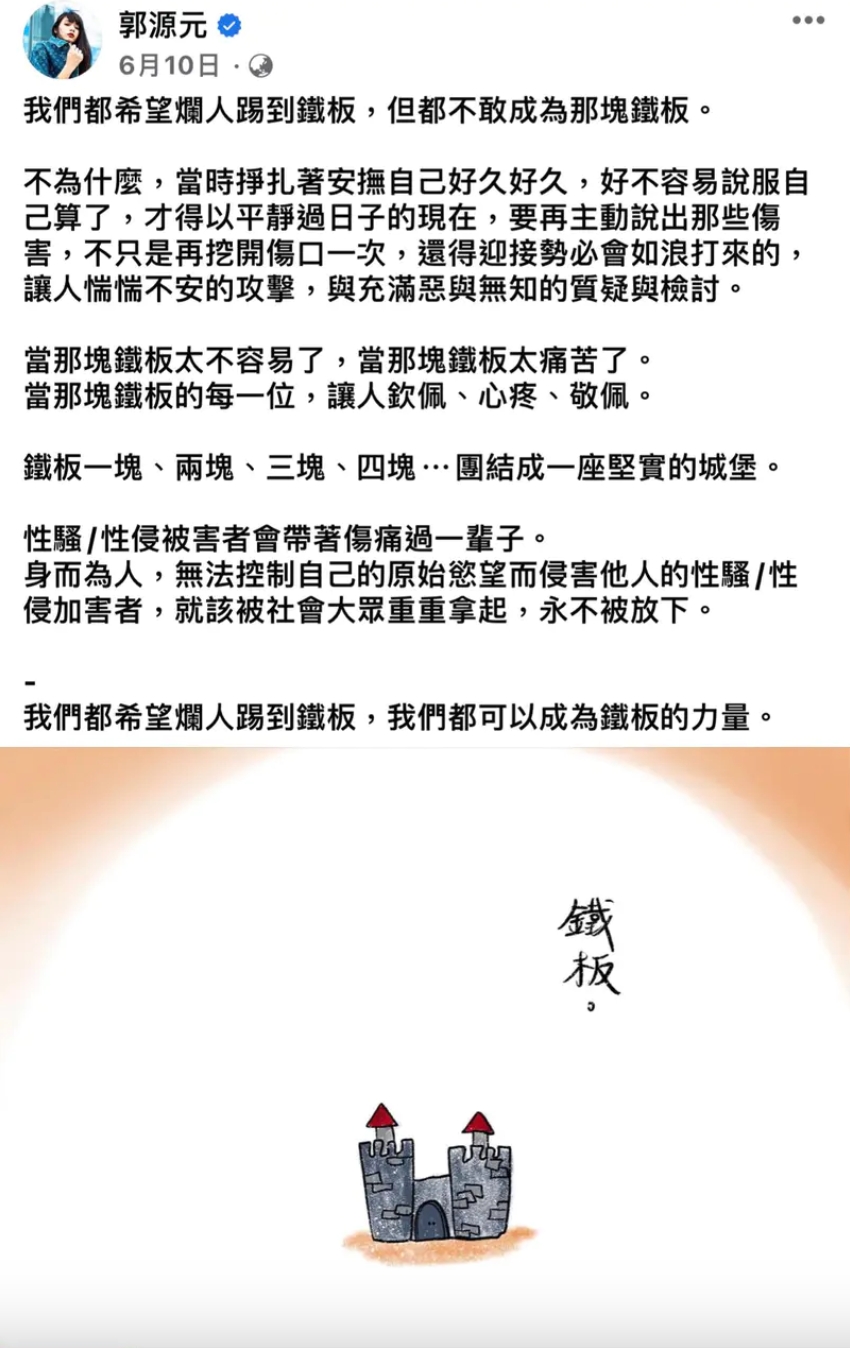 郭源元早在10日就曾表示:「我們都希望爛人踢到鐵板,但都不敢成為那塊鐵板。」只因為主動說出事發經過,就是再挖開傷口一次,還得面對惡意的質疑與檢討,她認為「當那塊鐵板太不容易了,當那塊鐵板太痛苦了。當那塊鐵板的每一位,讓人欽佩、心疼、敬佩。」受害者害還會帶著傷痛過一輩子,因此她直言加害者都不該被原諒,並表示:「我們都希望爛人踢到鐵板,我們都可以成為鐵板的力量。」