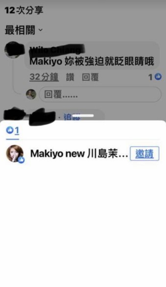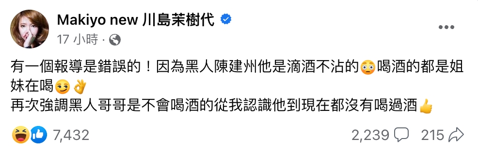 Makiyo也曾在節目爆料,黑人喝醉之後會到處亂親,而她在范瑋琪的力挺文曝光後,疑似寫下反串文:「有一個報導是錯誤的!因為黑人陳建州他是滴酒不沾的~喝酒的都是姐妹在喝,再次強調黑人哥哥是不會喝酒的,從我認識他到現在都沒有喝過酒。」由於原文中出現與文意不太符合的表情符號,因此有網友表示:「妳被強迫就眨眼睛哦」、「救救那些女生」,沒想到她竟然去按讚該留言,再度引起討論。