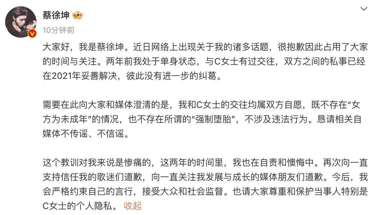 最後,蔡徐坤沉痛表示:「這個教訓對我來說是慘痛的,這兩年的時間裡,我也在自責和懊悔中。」也向歌迷們道歉,並承諾:「我會嚴格約束自己的言行,接受大眾和社會監督。也請大家尊重和保護當事人特別是C女士的個人隱私。」貼文曝光後,支持跟反對的聲浪都有,網友紛紛表示:「相信你」、「我們一直都在」、「所以愛豆談戀愛不戴套,讓女生打胎是真的了」、「總結:事是真的,墮胎也是真的,但是是正常交往,雙方已和解,至於其他的都是謠言,我也很愧疚,但是我更想繼續掙錢。 」