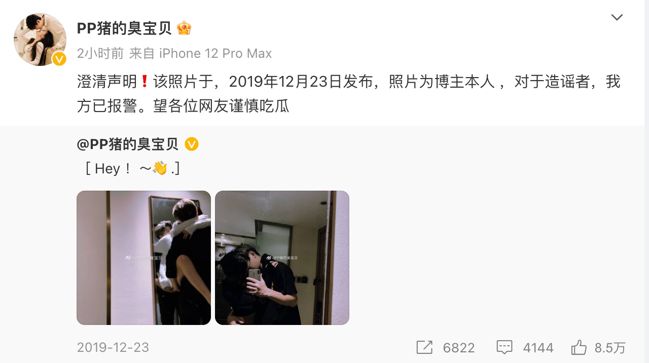 相關消息曝光後,立刻引起熱議,不過蔡徐坤則火速出面闢謠,「純屬造謠,已去報警!照片不是我!」而另一名博主「PP豬的臭寶貝」轉發自己在2019年12月公開的照片並表示:「澄清聲明!該照片於2019年12月23日發佈,照片為博主本人,對於造謠者,我方已報警。望各位網友謹慎吃瓜。」只見照片中,正是狗仔爆料提供的照片,坐實造假一事。
