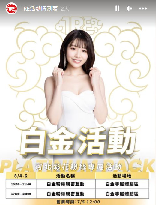 河北彩花本次在台灣成人展的活動官方也提前曝光,8月4日至8月6日三天都會有握手會以及親密互動的活動,握手會的時間是三天的13:10~14:00、15:40~16:30時段,白金會員的專屬活動則是三天的10:50~11:40、17:00~18:00,各為想要一睹SS級女優風采的老司機千萬不要錯過!