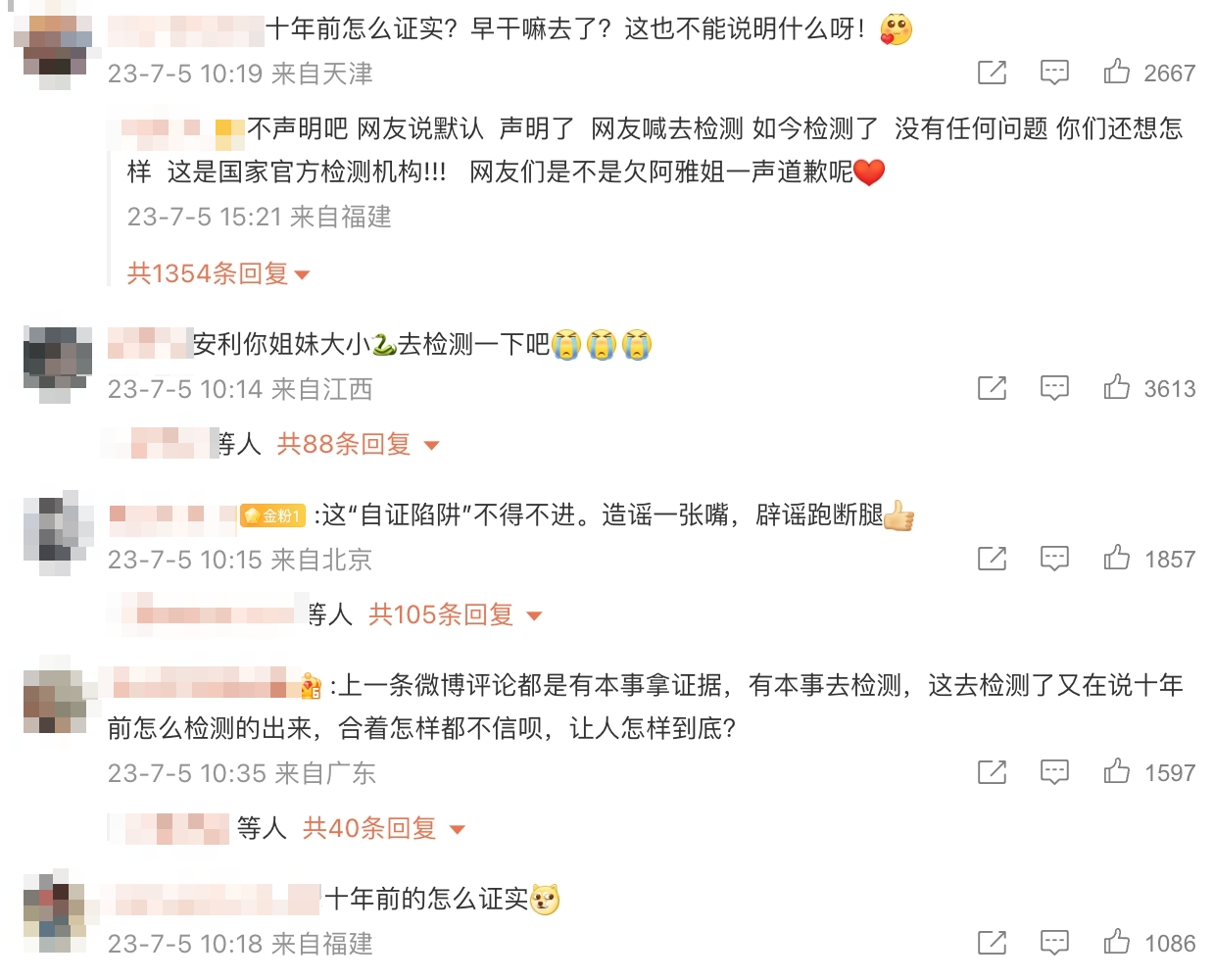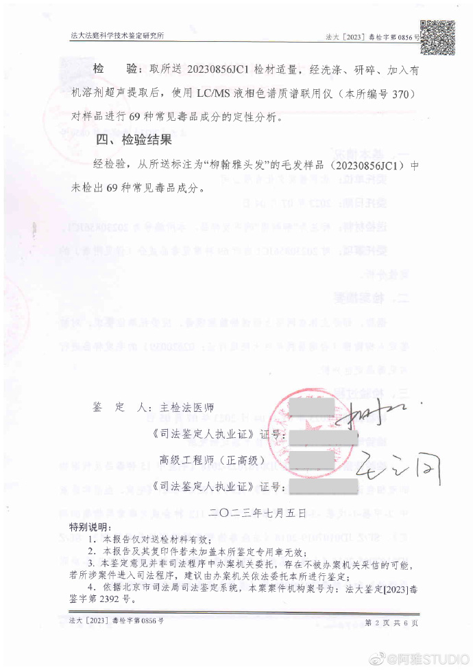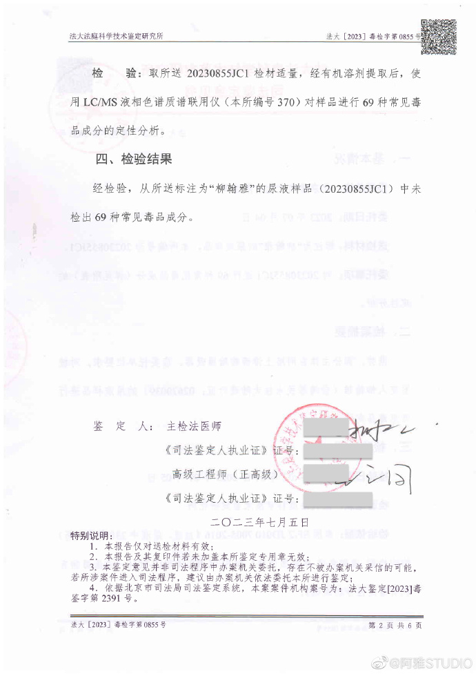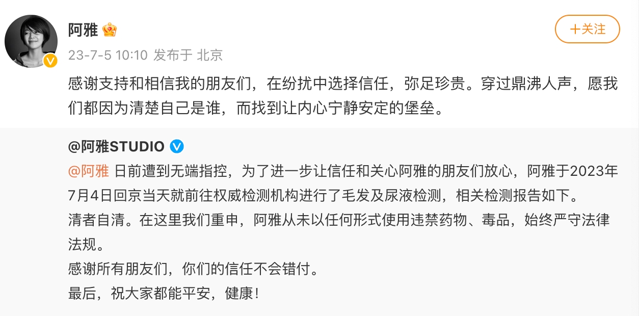 阿雅工作室5日在微博曬出毒品檢驗結果,毛髮跟尿液均沒有驗出69種毒品成分,她表示在2023年7月4日就到檢測機構進行檢測,「在這裡我們重申,阿雅從未以任何形式使用違禁藥物、毒品,始終嚴守法律法規。感謝所有朋友們,你們的信任不會錯付。」阿雅隨後轉發貼文並再度喊話:「感謝支援和相信我的朋友們,在紛擾中選擇信任,彌足珍貴。穿過鼎沸人聲,願我們都因為清楚自己是誰,而找到讓內心寧靜安定的堡壘。」