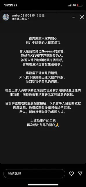 事件曝光後,新北啦啦隊隊長Amber在社群軟體親曝事件發生的經過,她表示:「謝謝大家的關心,事件當天是啦啦隊Queens的聚會,湊巧在KTV與聯盟的工作人員相遇,工作人員邀請他們前往包廂打聲招呼,沒想到竟然就發生這種事!」接著她更說道:「事件發生的當下她確實相當錯愕,所以她下意識的大動作掙脫並逃離該包廂,聯盟工作人員在事件發生後很快且狠有誠意的向她道歉,加上聯盟相當積極的處理本事件並將對他給予懲處,所以她才暫時接受聯盟的處理方式。」