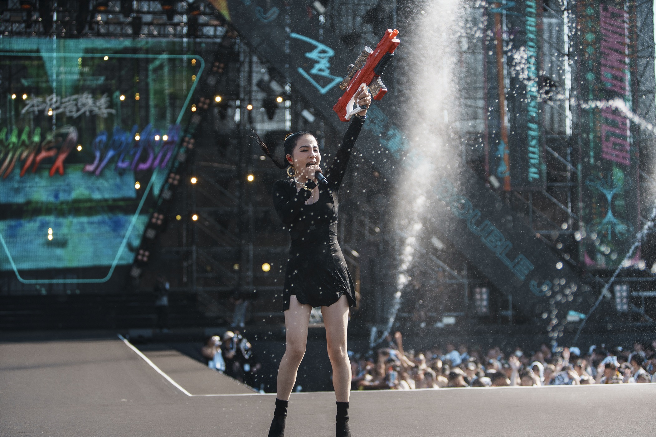 為了本色家族的大活動特別專程從福州趕回來參與盛會的呆寶靜昨天(7/8)一口氣演唱了九首歌與歌迷同歡,更首唱新歌〈ding ding duang duang〉,第一次參加這種大型潑水活動的她童心大起,除了不時地拿水槍跟大家玩水仗要大家嗨起來,更全程滿場飛一直跑跳帶動現場氣氛,可說是當天音樂季的最佳開心果!
