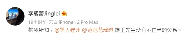 事實上,李靚蕾過去曾踢爆王力宏與「已婚女」約砲,還透露王力宏不惜違反規定「飛奔去找她家找她聚會」,由於男方曾因為不遵守防疫規定與陳建州、范瑋琪及徐若瑄等人聚會,因此「已婚女」的真實身份備受討論。不過,她還特地出面替黑范夫妻澄清:「據我所知,陳建州、范瑋琪跟王先生沒有不正當的關。」