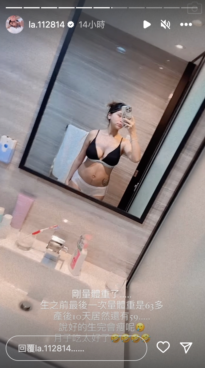 蕾菈16日在IG限時動態分享生產10天後的身材狀況,只見影片中,她身穿黑色內衣配白色底褲,看起來身材消風不少,但肚子依然有微微的贅肉,她無奈表示:「生之前最後一次量體重是63(公斤)多,產後10天居然還有59(公斤),說好的生完會瘦呢?月子吃太好了!」看來還需要一段時間才能恢復到心目中的理想體重。