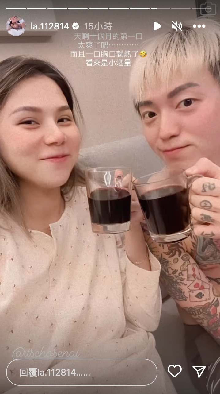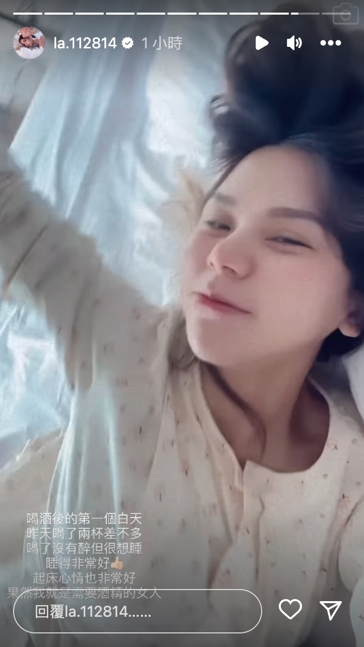 不僅如此,蕾菈在懷孕期間為了寶寶的健康而滴酒不沾,如今終於卸貨,她跟老公湯宇睽違約1年,終於再度一起小酌紅酒,她興奮表示:「天啊!十個月的第一口,太爽了吧!而且(喝)一口胸口就熱了,看來是小酒量。」臉上幸福的笑容完全藏不住。接著,她17日睡醒後就立刻發表酒後心得,「昨天喝了兩杯差不多,喝了沒有醉,但很想睡,睡得非常好~起床心情也非常好」,更笑說:「果然我就是需要酒精的女人!」
