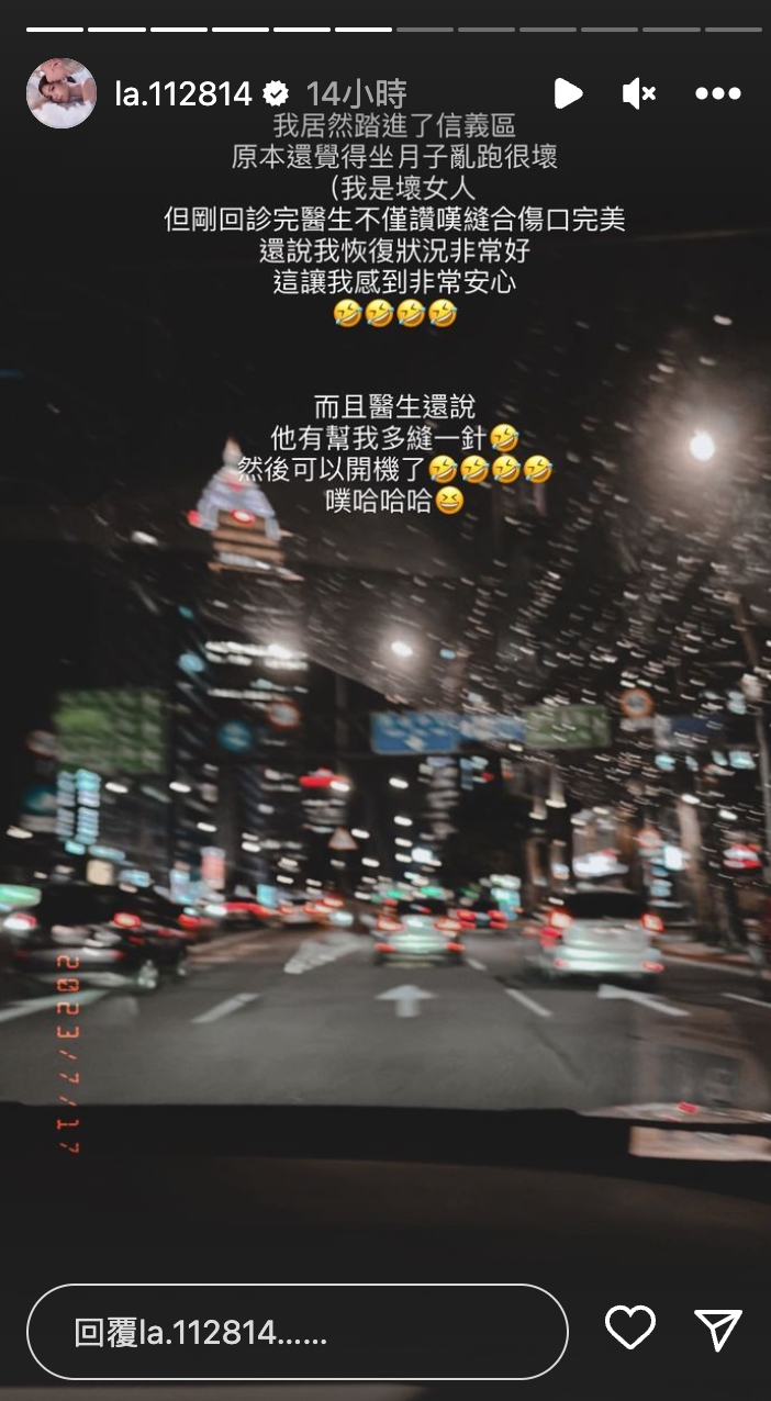 蕾菈16日在IG限時動態表示:「我居然踏進了信義區!原本還覺得坐月子亂跑很壞(我是壞女人),但剛回診完,醫生不僅讚嘆縫合傷口完美,還說我恢復狀況非常好」,讓她感到非常安心。不僅如此,醫師還跟她說當時縫合的時候有多縫一針,甚至現在就可以「開機」,讓她當場笑翻。