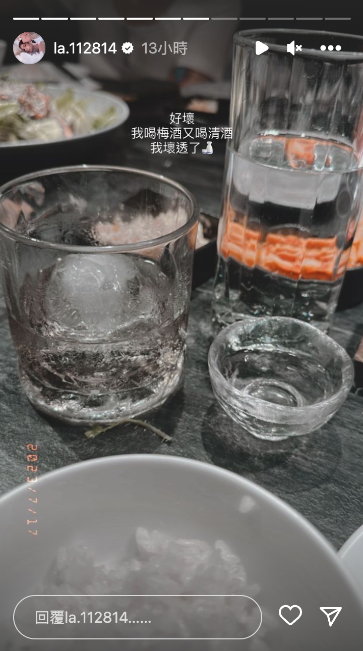 接著,蕾菈曬出在餐廳享用大餐的照片並自嘲:「好壞,我喝梅酒又喝清酒,我壞透了!」在此之前,她就在家先跟湯宇喝了一杯紅酒,由於她為了寶寶的安全,所以忌口10個月,如今久違喝到第一口酒,感覺得出來心情既興奮又快樂!接著,她17日睡醒後就立刻發表酒後心得,「昨天喝了兩杯差不多,喝了沒有醉,但很想睡,睡得非常好~起床心情也非常好」,更笑說:「果然我就是需要酒精的女人!」