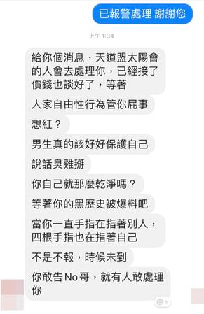 近日小紅老師收到私訊,對方透漏「給你個消息,天道盟太陽會的人已經談好價錢準備要去處理你了!」、「人家自由性行為關你屁事?」「敢告NO哥,就有人敢處理妳」等多條威脅訊息,此外該威脅人還稱男生真的要保護好自己,「人家自由性行為關妳屁事,想紅?」