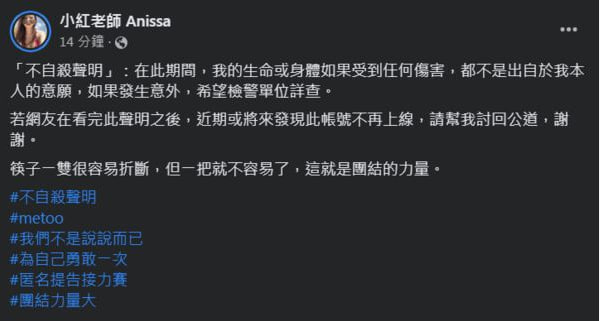 對此,小紅老師只好PO出不自殺聲明,表明如果在這段期間,身體受到任何傷害都不是出於她的意願,「如果發生意外,希望檢警單位詳查。若網友在看完此聲明之後,近期或將來發現此帳號不再上線,請幫我討回公道,謝謝。」