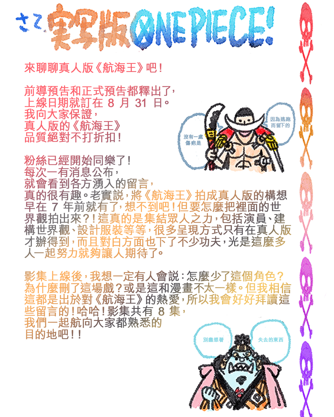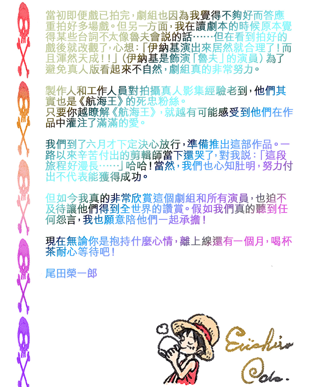 尾田老師在信中分享了他對真人版改編、製作過程、
