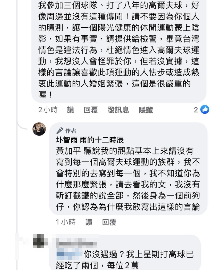 圤智雨日前發表關於高爾夫性交易的言論後,有網友透露自己接觸高爾夫長達8年,從來沒有聽聞這種事情,不滿表示:「請不要因為你個人的臆測,讓一個陽光健康的休閒運動蒙上陰影。」對此,其他人接著自爆前一週花了總共4萬元找兩位小姐,圤智雨將貼文轉發到限時動態後,吳夢夢驚訝表示:「兩萬好少!我以為漂亮女生都要三、五萬,只是市場行情低於我的認知而已。」