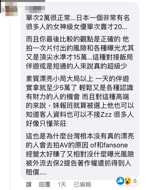 貼文曝光後,再度掀起討問,大家紛紛表示:「拍AV不能每天拍,但可以天天打高爾夫,還可能一天幾次吧?我反而覺得拍一部才15萬才是真的少」、「都是為了錢去,只是一個明、一個暗」,也有人認為單次2萬元是很正常的價碼,透露日本有一位女神級的女優單次的價格也才20萬,所以對於接飯局或伴遊的人來說,反而是小姐,因為一天就有可能賺到5萬以上。