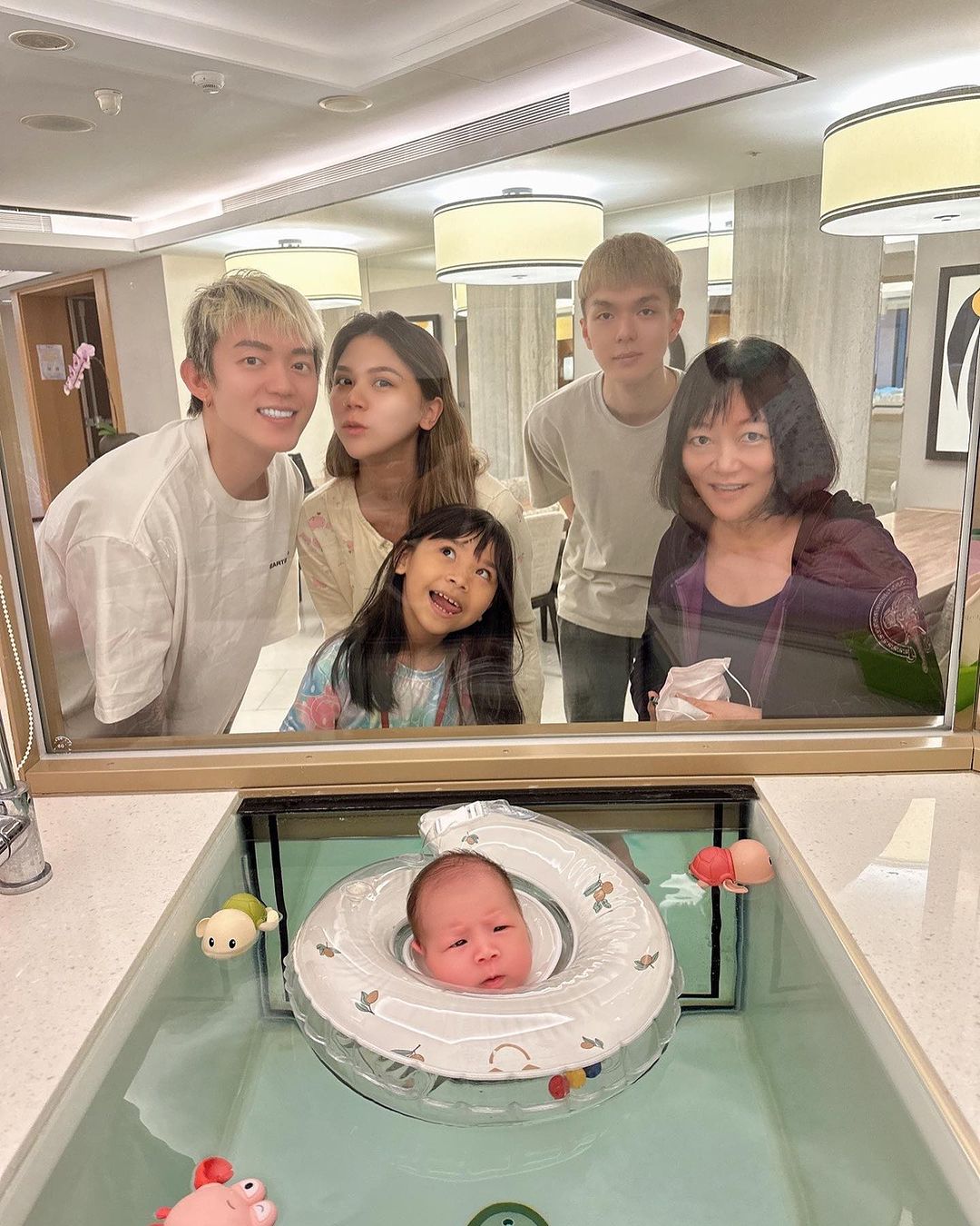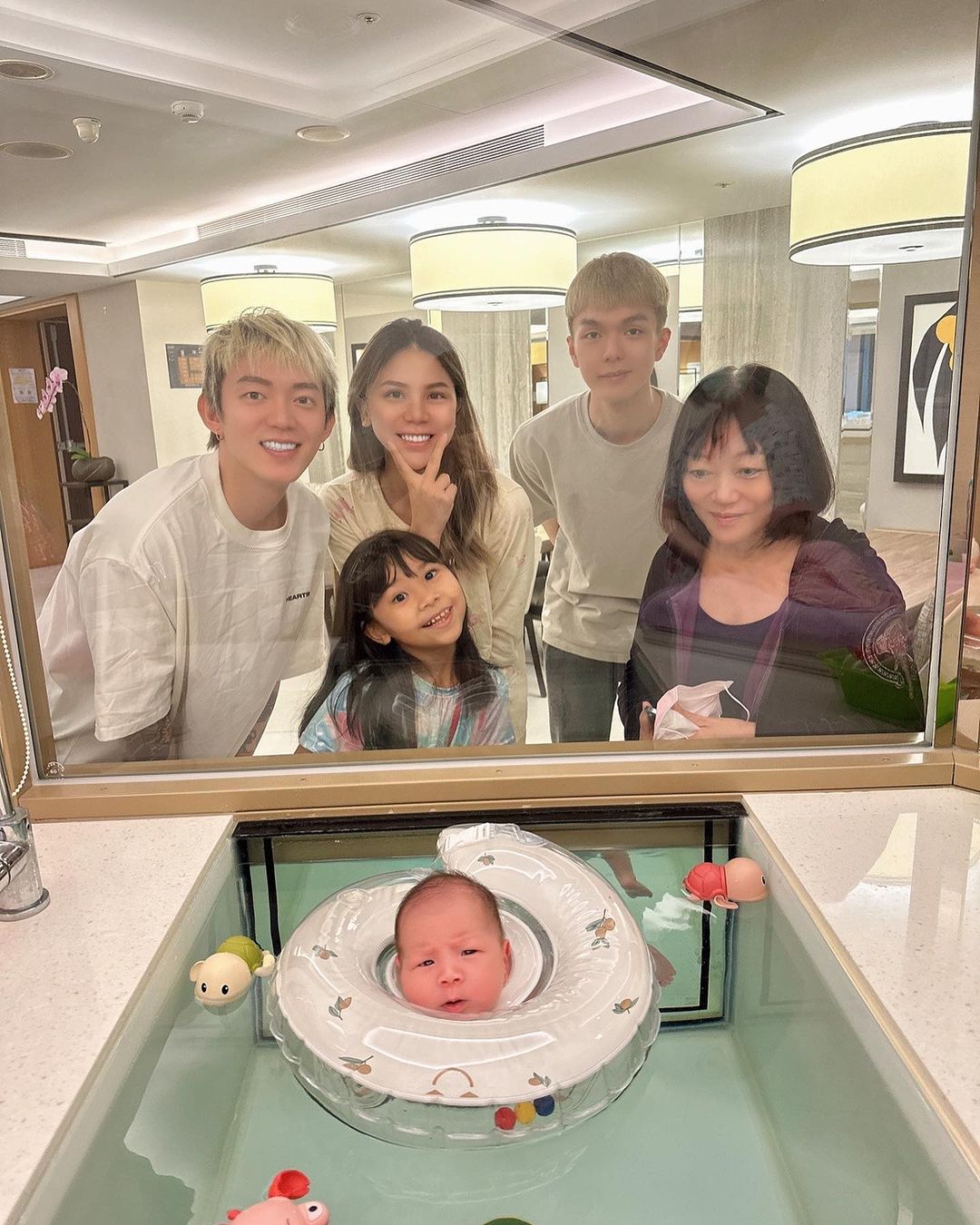 只見照片中,蕾菈一家三口跟湯宇的家人都站在玻璃窗前跟兒子合照,大家臉上都掛著開心的笑容,只有湯包是苦瓜臉,似乎對於下水游泳還感到很陌生。有趣的是,蕾菈、蝶蝶及湯包剛好排成一直線,三個人彷彿同一個模子印出來一樣,相似度超級高!