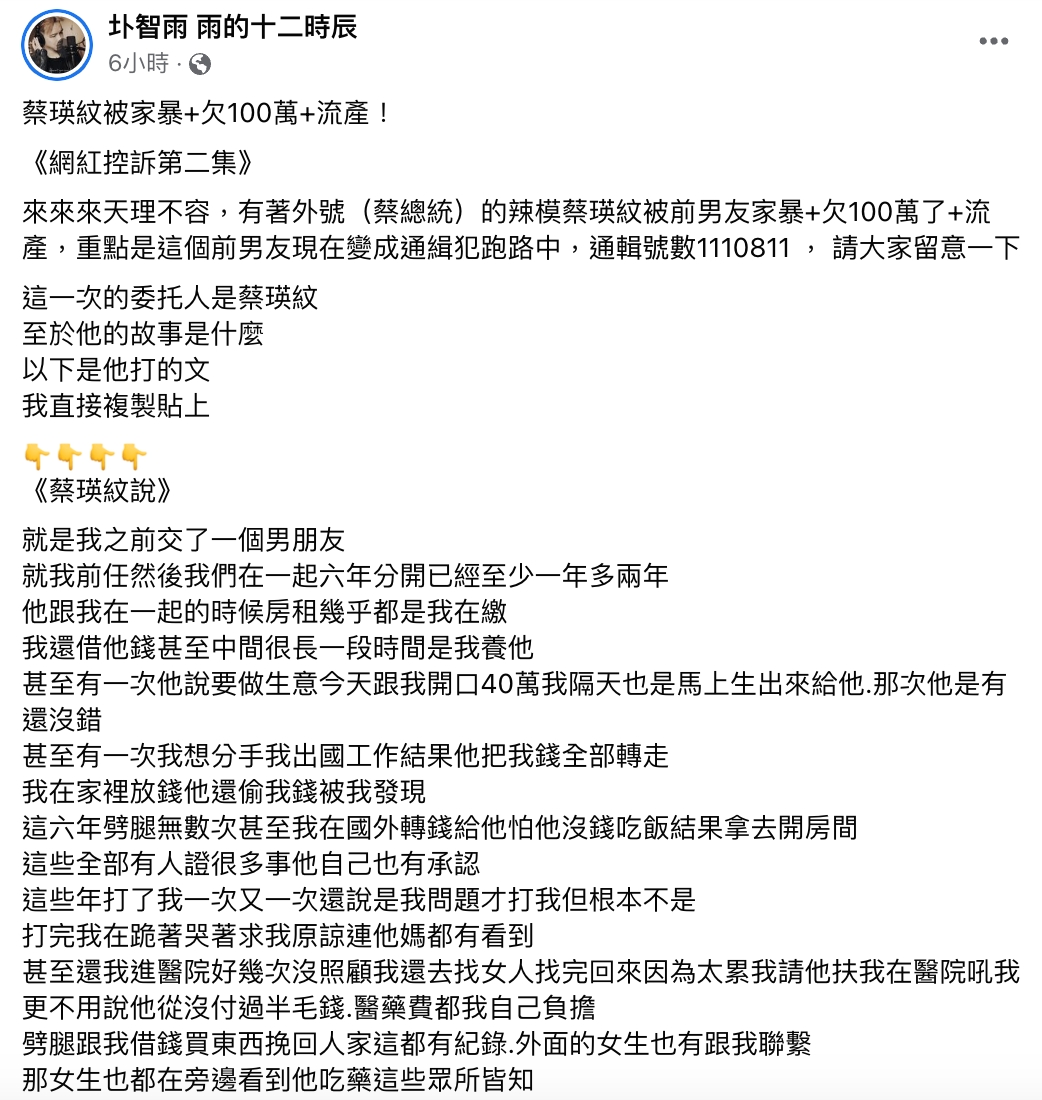 前謎片導演圤智雨日前透過臉書替辣模「蔡瑛紋」發聲,透露跟前男友交往共6年期間,對方無數次劈腿,還跟她借錢拿去開房間,甚至多次施暴害她進醫院,就連懷孕時都被打到流產,更坦言:「有些傷永久不會復原了」。