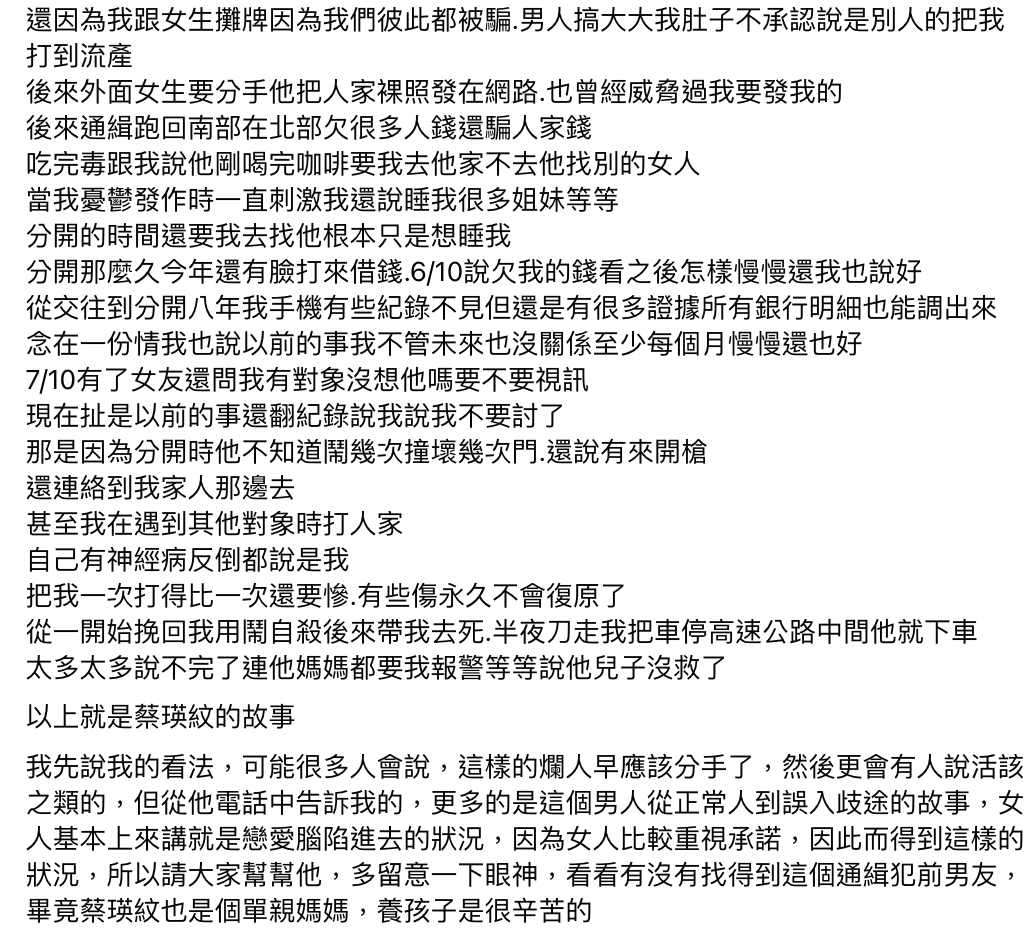 不僅如此,蔡瑛紋更公開身上的傷疤跟瘀血,手臂、手掌甚至是臉都無一倖免,十分怵目驚心。圤智雨則表示:「女人基本上來講就是戀愛腦陷進去的狀況,因為女人比較重視承諾」,所以希望大家都能多幫助她,儘早抓到通緝犯前男友。