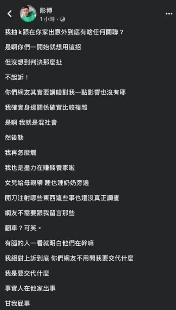 對此,彫博在臉書火大表示:「我抽K跟在你家出意外到底有啥任何關聯?」認為對方一開始就想使用這招,「但沒想到判決那麼扯,不起訴!」他坦言交友關係的確比較複雜,但也是盡力在賺錢養家,「開刀、注射哪些東西這些事也還沒真正調查」,更火大地說:「網友不用問我要交代什麼,我是要交代什麼?事實人在他家出事,甘我屁事!」
