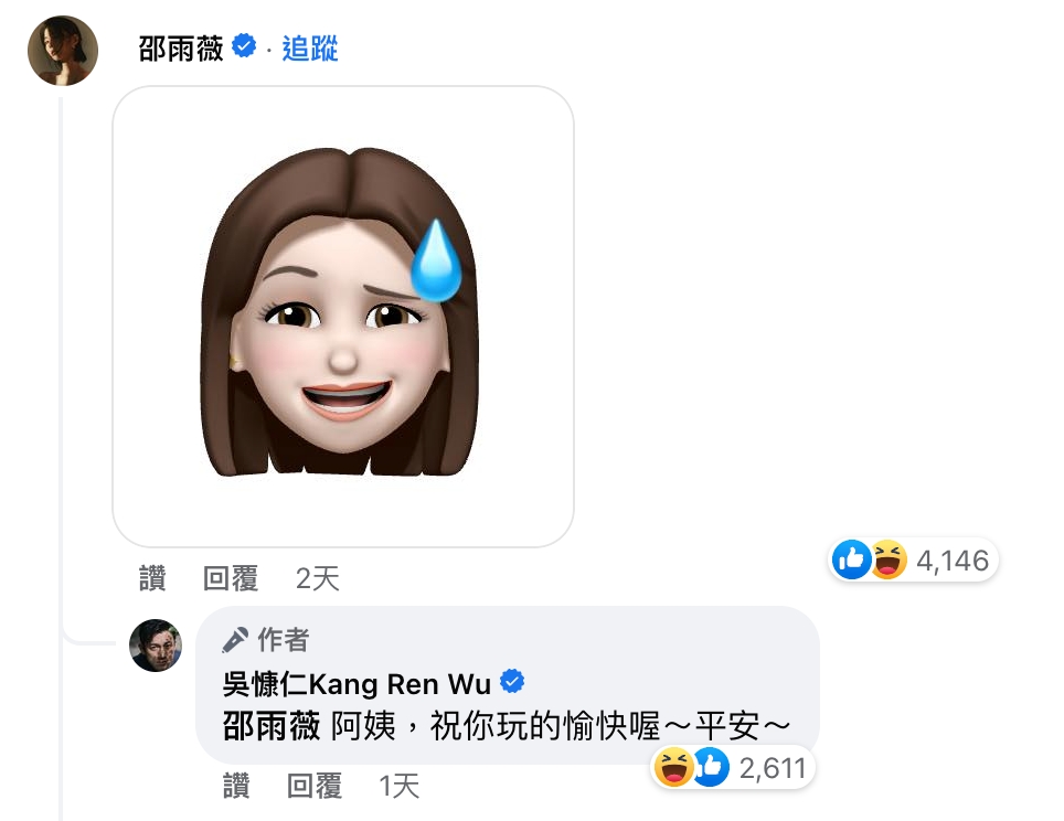 對此,邵雨薇在留言區留下尷尬的表情符號,沒想到吳慷仁竟回覆:「 阿姨,祝你玩的愉快喔~平安~」稱號從姊姊變成阿姨,網友見狀都吐槽:「你生命線是不是太長?」其他人則表示:「現在不入坑之後也會入坑」、「小姐姐願意幫你拍真的好大器」、「沒想到你也是Bunnies」,還有人幫忙許願,「有一天一定會看到你和Haerin一起跳Challenge」,他則興奮地說:「讚讚讚!」
