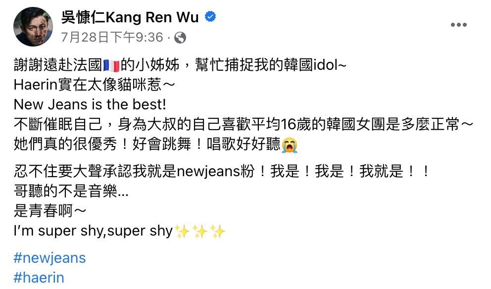 吳慷仁日前在臉書曬出NewJeans成員Haerin為精品代言的照片,並開心表示:「謝謝遠赴法國的小姊姊,幫忙捕捉我的韓國idol~」而這位小姊姊正是最近到國外度假的女友邵雨薇。他接著化身「迷弟」開心地說:「Haerin實在太像貓咪惹~NewJeans is the best!」由於NewJeans最年長的成員也只有19歲,跟他相差21歲,因此他只好不斷催眠自己,這是一件很正常的事情。
