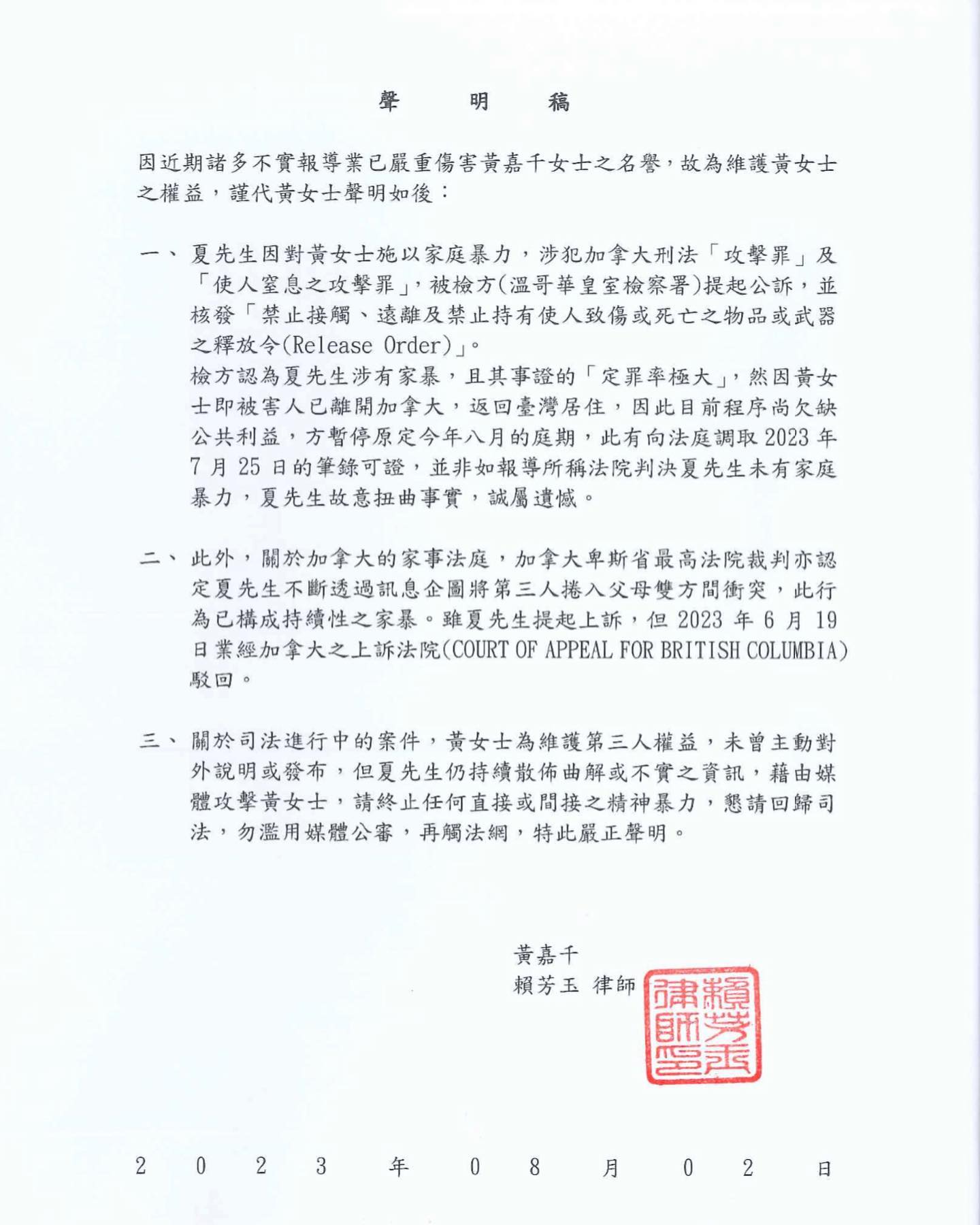 藝人黃嘉千跟夏克立於去年離婚,怎料隨後竟傳出男生家暴,雙方分別在台灣、加拿大打官司,雖然加拿大最新的判決指出家暴罪名不成立,但夏克立卻自爆吃盡苦頭,不僅冤枉入獄,還被逼到只能流浪街頭。對此,黃嘉千的友人出面指控他在「裝可憐」,實際上在加拿大很有錢。