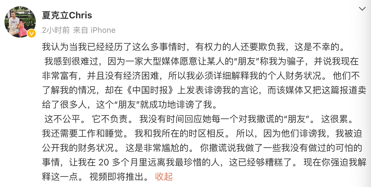 對此,夏克立4日一早在微博發文表示:「我認為當我已經經歷了這麼多事情時,有權力的人還要欺負我,這是不幸的。」他認為自己還需要工作跟睡覺,但黃嘉千的友人不了解自己的狀況,卻發表誹謗的言論,導致他被迫回應跟公開財務狀況,並透露未來會透過影片證明。