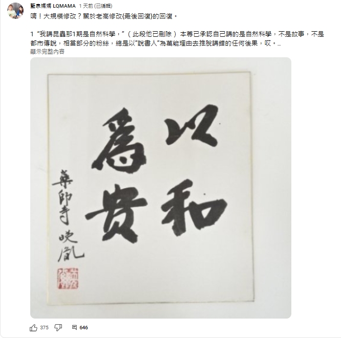 近期老高抄襲事件持續延燒,藍泉媽媽不放過反擊機會,針對重新編輯貼文又刪除的行為,他狠酸:「我建議老高,不要再發文回應了,畢竟您的時間寶貴,還要Imitating writing更多的影片,不關心的根本不care,最多吃個瓜轉身就雞排飯加個蛋。 」也向支持自己的觀眾喊話:「支持我們的,鳳毛麟角,但我們會珍惜守護,交由我們自己。 您做的您的熱門影片,展示您浩瀚博學的知識,我們則繼續做nobody。」