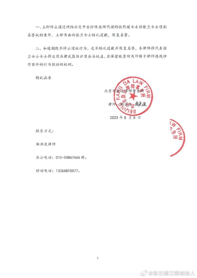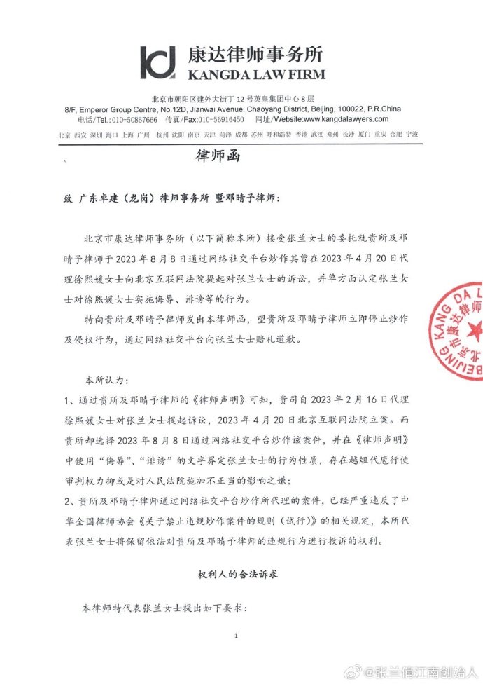 張蘭9日在微博曬出律師聲明,指出大S已經在今年2月16日提出訴訟,4月20日北京互聯網法院立案,「而貴所卻選擇2023年8月8日通過網絡社交平台炒作該案件,並在《律師聲明》中使用『侮辱』、『誹謗』的文字界定張蘭女士的行為性質」,質疑大S故意施加不正當的影響。