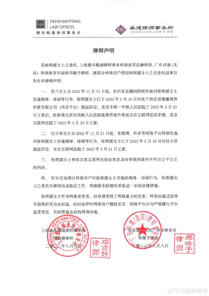 事實上,大S透過律師發出聲明表示,張蘭跟汪小菲自2022年11月21日起,「在微博、抖音等網絡平台持續性地對徐熙媛女士實施侮辱、誹謗等行為」,因此已經對兩位提告。另外,聲明中還指出大S身為網路暴力的受害者,「切身感受到了網絡暴力的危害」,因此要透過法律維護權益。