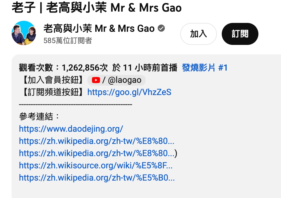 老高的新片主題是「老子」,不過他在一開始大大的秀出「鄭重道歉」四個字,接著透露錄製影片時,因為洗衣機恰巧在運轉,所以聲音品質不太好,希望大家見諒。值得注意的是,針對近日的抄襲風波,老高表示:「從本影片開始,本頻道所有影片的參考資料均會在影片說明欄中進行標註,我們也會儘量滿足大家的所有要求,謝謝。」而影片資訊欄的確有別於以往,放上了包含維基百科的網址。