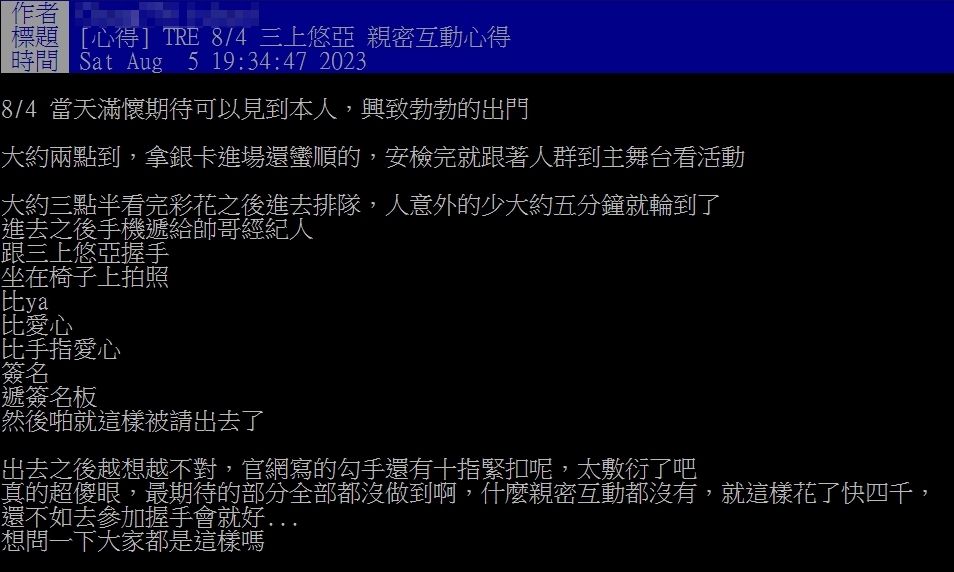 女優「三上悠亞」近日來台參與「TRE台北國際成人展」,吸引大票老司機,想目睹本人的風采和親密互動,但有名網友在展期結束後於PTT版上發文,表示為了跟三上悠亞近距離互動花了近4千元,實際參與活動後,卻氣憤認為:「太敷衍了吧」,他表示當時進場後,把手機交給經紀人,跟三上悠亞進行拍照互動,也一起比Ya、愛心、手指愛心等三連拍,結果原本說好的十指緊扣全都沒有,簽完名之後就被請出去。但原PO事後想想不對勁,官網聲稱可以勾手還有十指緊扣,最後卻沒做到,倒不如去參加握手會,也詢問有去現場粉絲的意見。