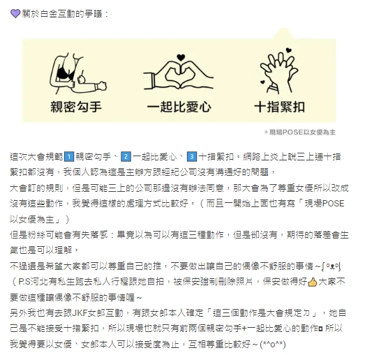 不過對於官方宣稱的十指緊扣引發爭議,表示可理解粉絲因與期待有落差,產生憤怒的心情,但原PO認為這並非三上悠亞的錯,表示可能是主辦單位沒跟經紀公司溝通好,官網聲稱可十指緊扣,可能經紀方無法同意,基於對女優尊重,粉絲才會沒有這個互動,希望大家都可以尊重偶像,不要做出讓對方不舒服的事情。而原PO在板上也曬出多張照片,其中一張三上悠亞經紀人的照片引發網友關注。