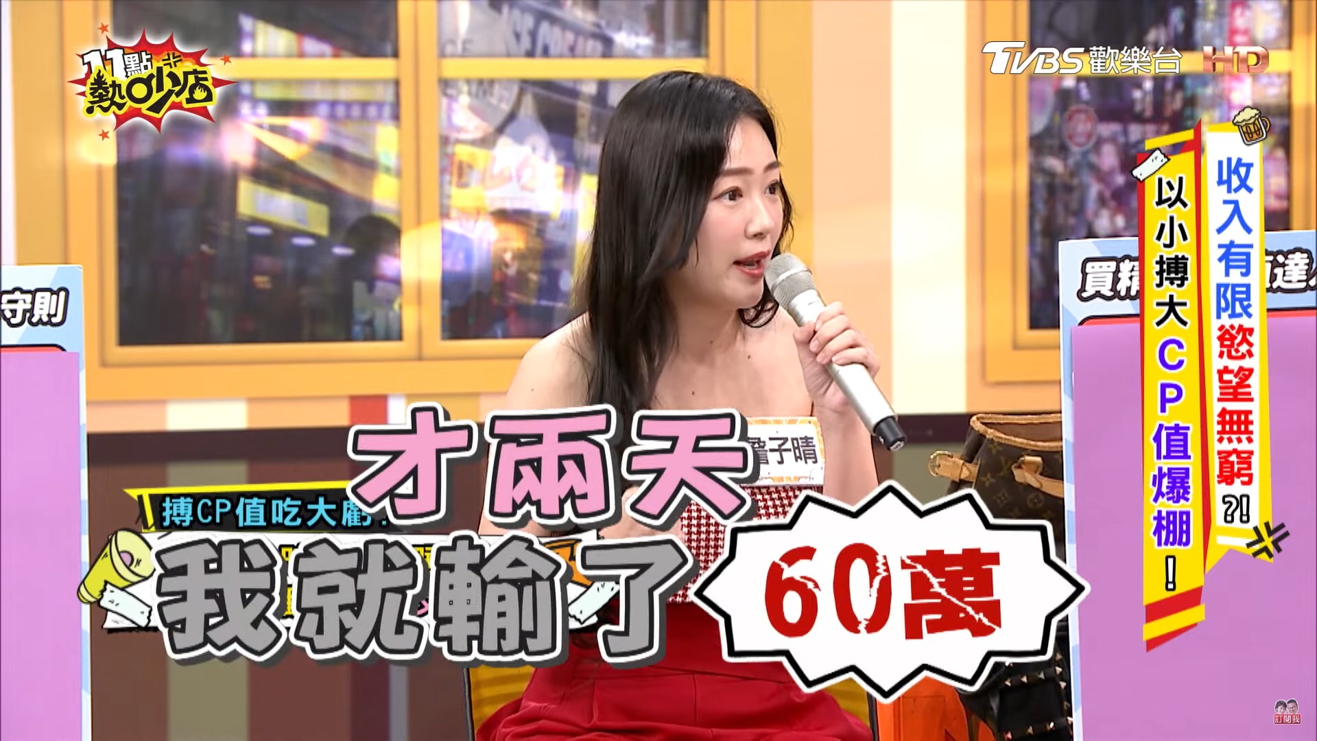 丫頭上近日上《11點熱炒店》透露過去每年都會去拉斯維加斯小賭怡情,去到那裡的公關都認識她,某次公關建議她可以打積分,就能獲得免費飯店住宿,如果打到1萬的積分,還能獲得5千美金,但缺點必須一直坐在位置上,於是她就嘗試打積分,預計來7天的旅程時間可以慢慢去累積積分,沒想到第2天,居然就慘輸60萬台幣,讓場上來賓及主持人都嚇傻。