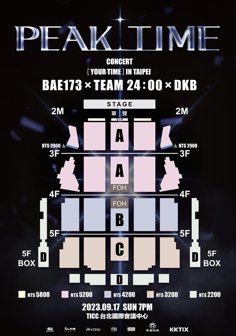 從台上來到CONCERT!號召集結已出道男團為名一較高下,堪稱今年最精彩、各團實力最接近的「PEAK TIME」,自播出後便受到龐大粉絲關注,隨著每個團體一步一腳印朝著夢想邁進,節目賽制過程中,不但有辛酸痛楚,也有著豐富的情感堆積,讓不少粉絲自願化身啦啦隊,不吝嗇成為他們的堅強後盾!日前成功舉辦完日場與夜場的「PEAK TIME CONCERT [YOUR TIME] IN TAIPEI(VANNER x SEVENUS x M.O.N.T)」後,主辦單位以最快時間重磅宣布,「PEAK TIME」第三名TEAM 24:00的金丙周、文鐘業、熙都、GON四位成員;第四名DKB的E-CHAN、D1、TEO、GK、HEECHAN、LUNE、JUNSEO、YUKU、HARRY-JUNE九位成員,以及第五名BAE173的J-MIN、翰潔、YOOJUN、MUZIN、JUNSEO、YOUNGSEO、DOHA、BIT八位成員,共計二十一帥將在9/17空降「台北TICC國際會議中心」開唱,屆時不但要帥翻現場,還要用最精彩的舞台演出,帶給所有粉絲最HIGH的享受!