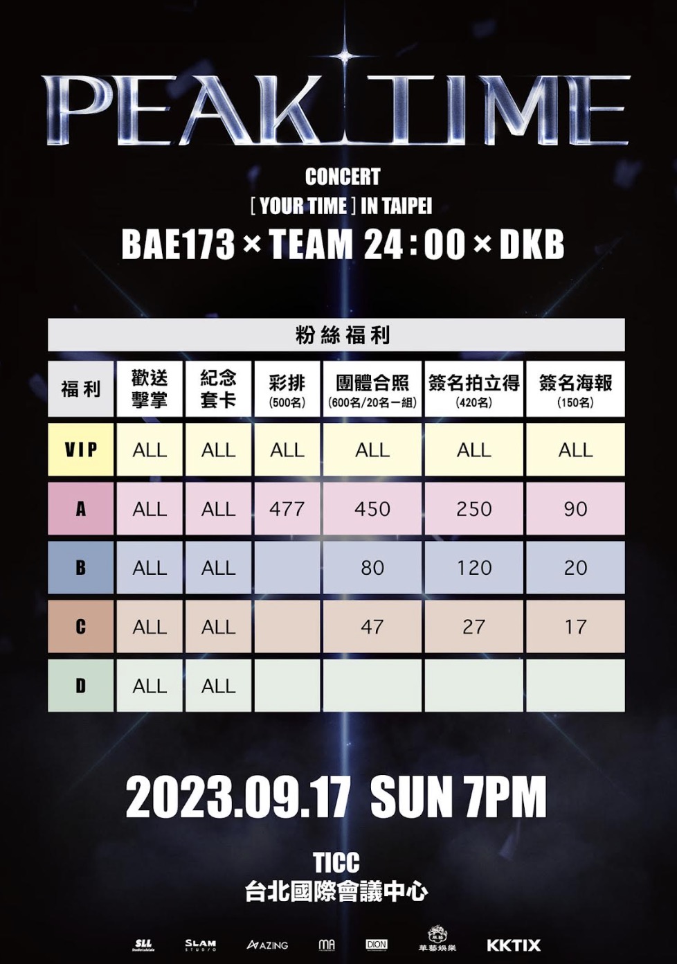 舉辦完賽制後,「PEAK TIME」冠軍至第六名,除了5/5至7號三日,在首爾共舉行五場演出,6/24、25號在釜山共舉行兩場演出,緊接著也在7/22、23號再回首爾舉辦安可場,「PEAK TIME」六團合體巡演便暫時告一段落,除了期間7/15當天,一連來台北舉辦日場與夜場的「PEAK TIME CONCERT [YOUR TIME] IN TAIPEI(VANNER x SEVENUS x M.O.N.T)」外,每組團體均工作滿檔,紛紛展開各類商演與訂製新專輯等行程,因此讓「PEAK TIME CONCERT [YOUR TIME] IN TAIPEI(TEAM 24:00 x DKB x BAE173)」三組人氣團於9/17合體更是珍貴可期,而三組成員也不約而同表示,超期待這次台北之行,更要親自與所有粉絲致上感謝支持:「這次能親自來到大家面前,我們非常開心,聽說粉絲相當熱情,當天我們除了將帶來最精彩的演出外,也希望能好好的跟所有粉絲答謝,各位每一個加油與掌聲,我們都收到了!」。