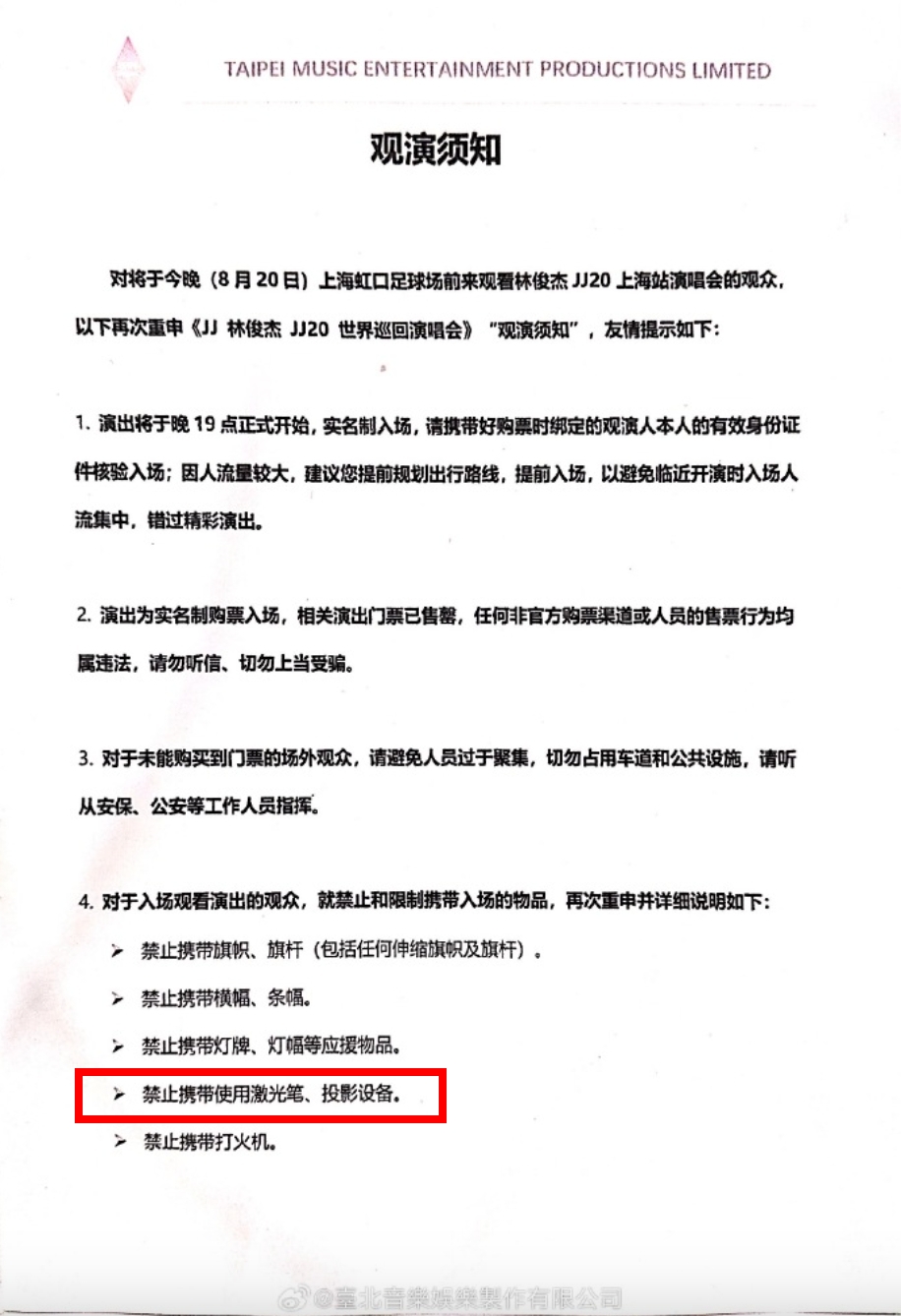 對此,林俊傑在20日開演前特地發佈觀演須知,明訂「禁止攜帶使用激光筆、投影設備」等,並在內文中表示:「再次重申!友善提示!」展現出保護藝人的決心。