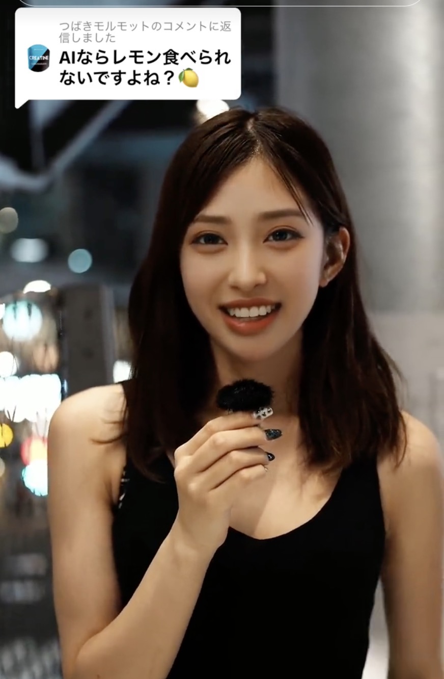 據悉,橫空出世的「@lemon___ai」雖然粉絲數不高,但是每每發布新影片,都能引起極高的話題度,從影片中可見,她不僅能對著鏡頭與粉絲互動,還能做出各種真人的動作、表情,甚至可以吃東西,不仔細看真的有可能會誤以為是真人,讓許多網友看到後直呼:「好真實又好不真實...」、「拜託跟我結婚」、「有預感之後會很紅」、「科技什麼都辦得到」。