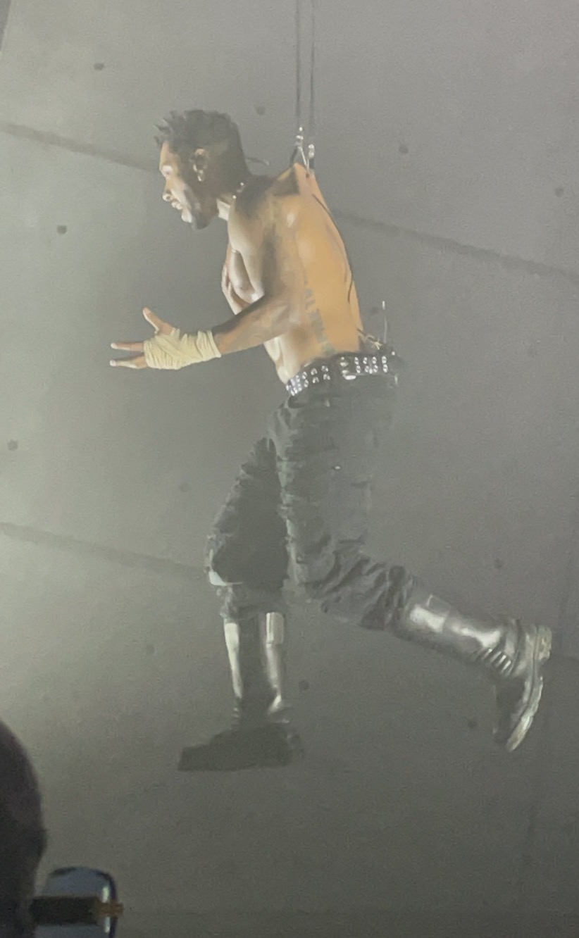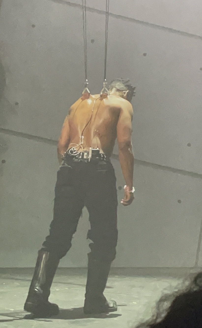 裝備就緒後,Miguel緩慢的被吊掛上升,從網上曝光的畫面可見,Miguel背上兩處皮膚就這樣支撐起他整個人的體重,他一邊懸空,一邊演出,過程中他面露痛苦神情,鮮血最終從背上流了下來,但他依舊完成了長達4分鐘的表演,結束後緩緩將金屬掛鉤取下。